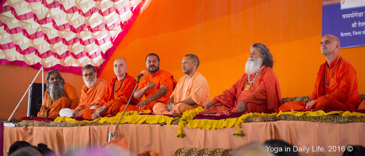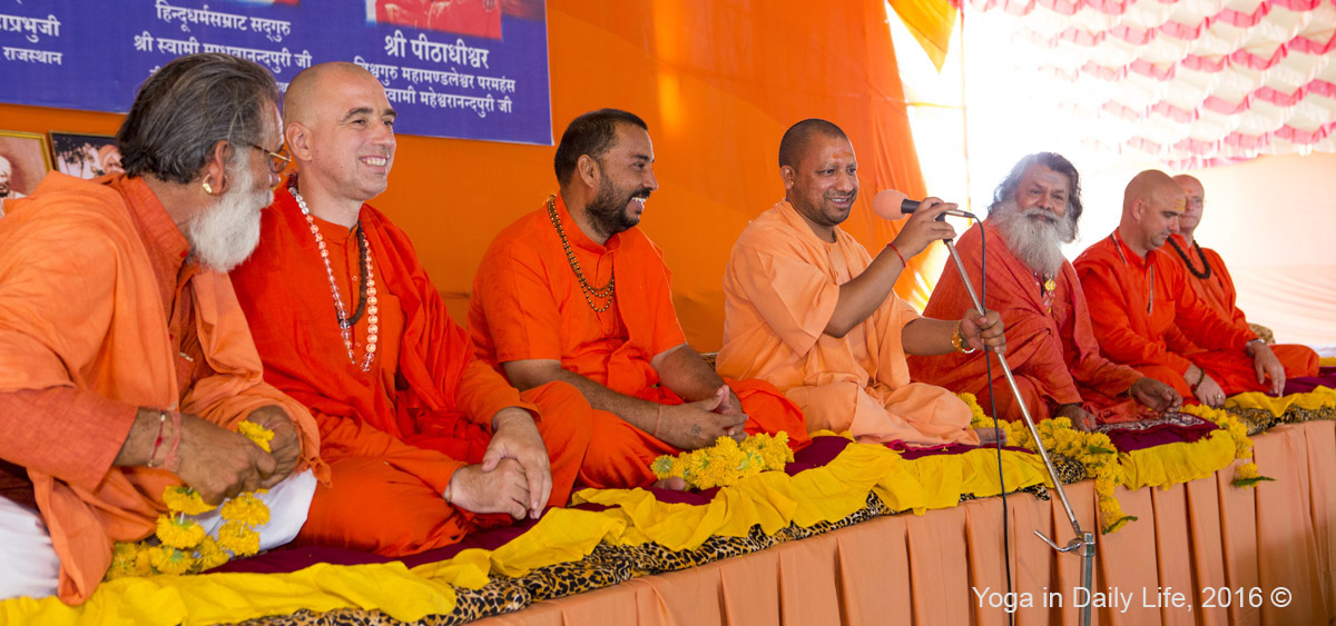 On Saturday 7 May 2016, all the bhaktas in the Om Sri Alakhpuriji Siddha Peeth Parampara camp were greatly honored by the visit of Yogi Adityanath Ji, Mahant of Gorakhnath Mutt and member of Indian Parliament. Vishwaguruji welcomed His Holiness and other attending Mahamandaleshwars, with heartful greetings and flower malas in full respect of the occasion.