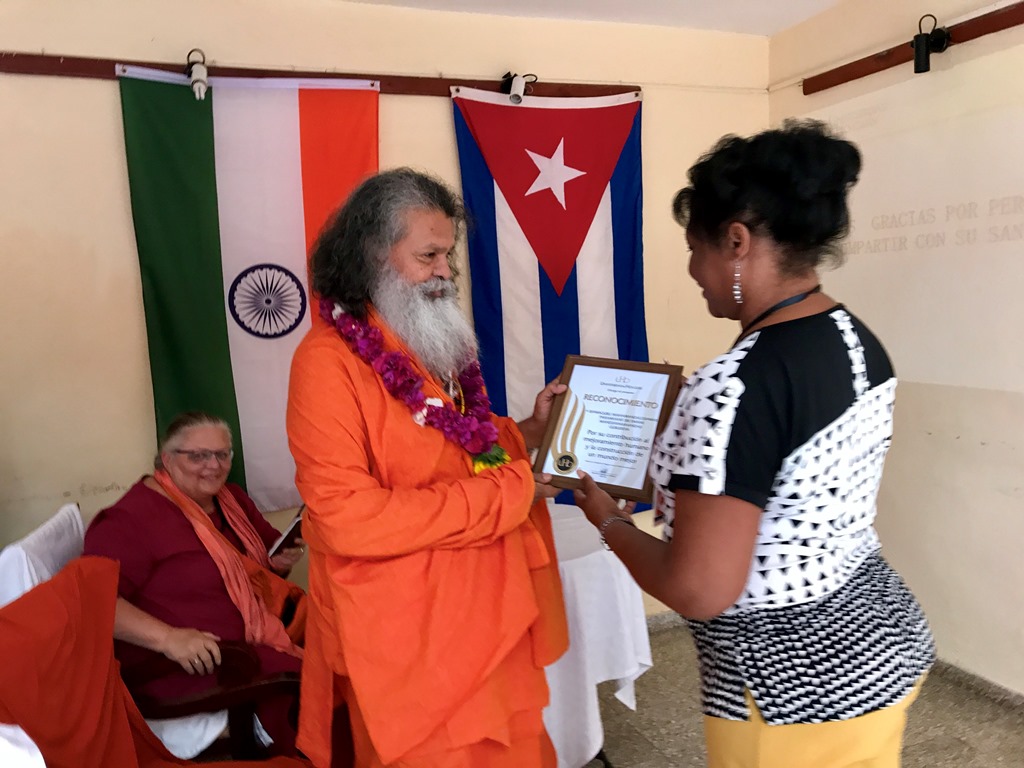 Vishwaguruji completed his historic first visit to Cuba with further cultural exchanges and the planting of two Peace Trees in Playa Guardalavaca, a small town near the sea, and in the Holguin Botanical Gardens, in honor of YIDL's distinguished lineage. In recognition of his decades of promoting yoga and humanitarian activities and this personal visit to Cuba, the Casa de Iberoamerica in the city of Holguin also awarded him with a golden plaque with the symbol of the city. The award was authorized by the highest levels of the Provincial Government.