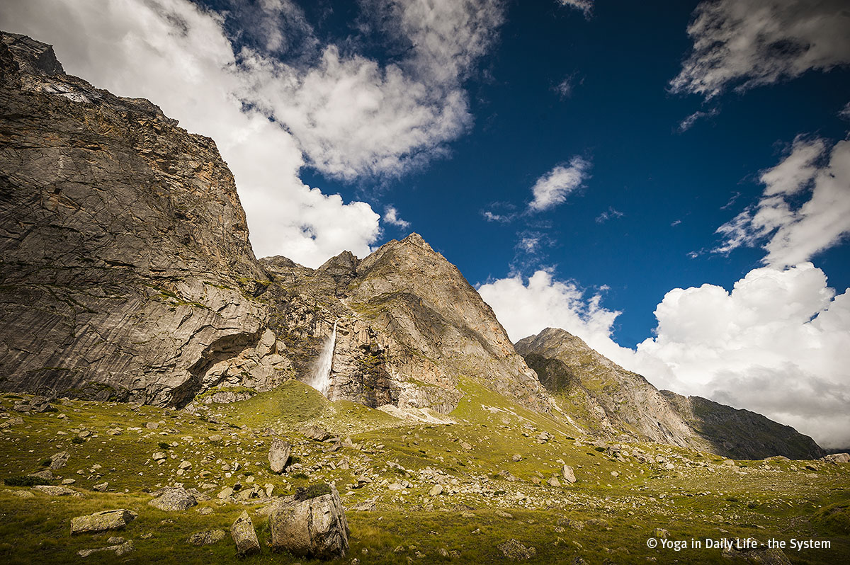 After Mana, the route passes by the Vasudhara Falls to the most sacred place for the Sri Alakhpuriji Siddhapeeth Parampara (lineage).