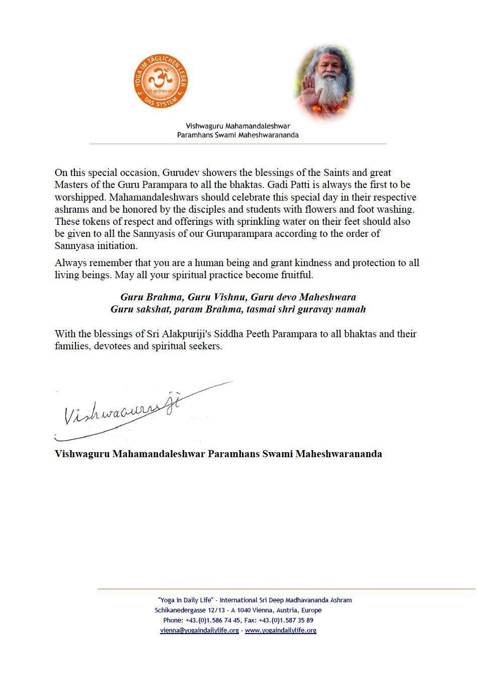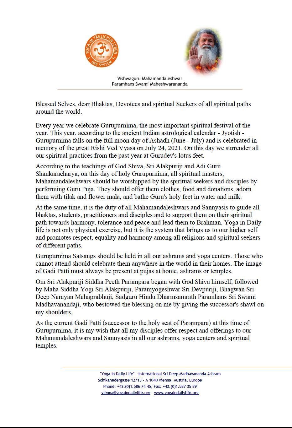Vishwaguru Mahamandaleshwar Paramhans Sri Swami Maheshwaranandaji's message on the occasion of Gurupurnima 2021