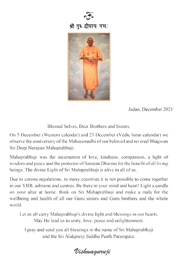 05 December 2021 News Mahasamadhi anniversary of Sri Deep Narayan Mahaprabhuji 2021 Vishwaguruji's message on anniversary of the Mahasamadhi of Bhagwan Sri Deep Narayan Mahaprabhuji Read about Bhagwan Sri Deep Narayan Mahaprabhuji Whatsapp