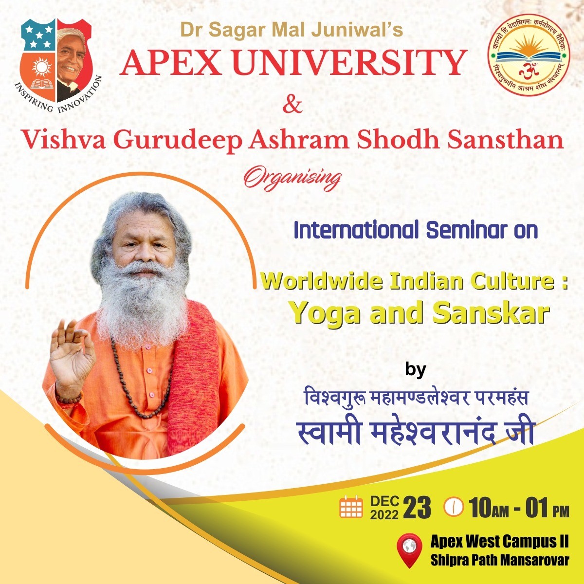 22 - 23 December 2022 – Vishwaguru Paramhans Sri Swami Maheshwaranandaji began his winter visit to India in Jadan Ashram and is now spending a few days with his bhaktas in Vishwa Guru Deep Ashram in Jaipur, where an International Conference on the topic of Indian Culture Worldwide – Yoga and Sanskriti will be held on 23 December 2022, at Apex University.