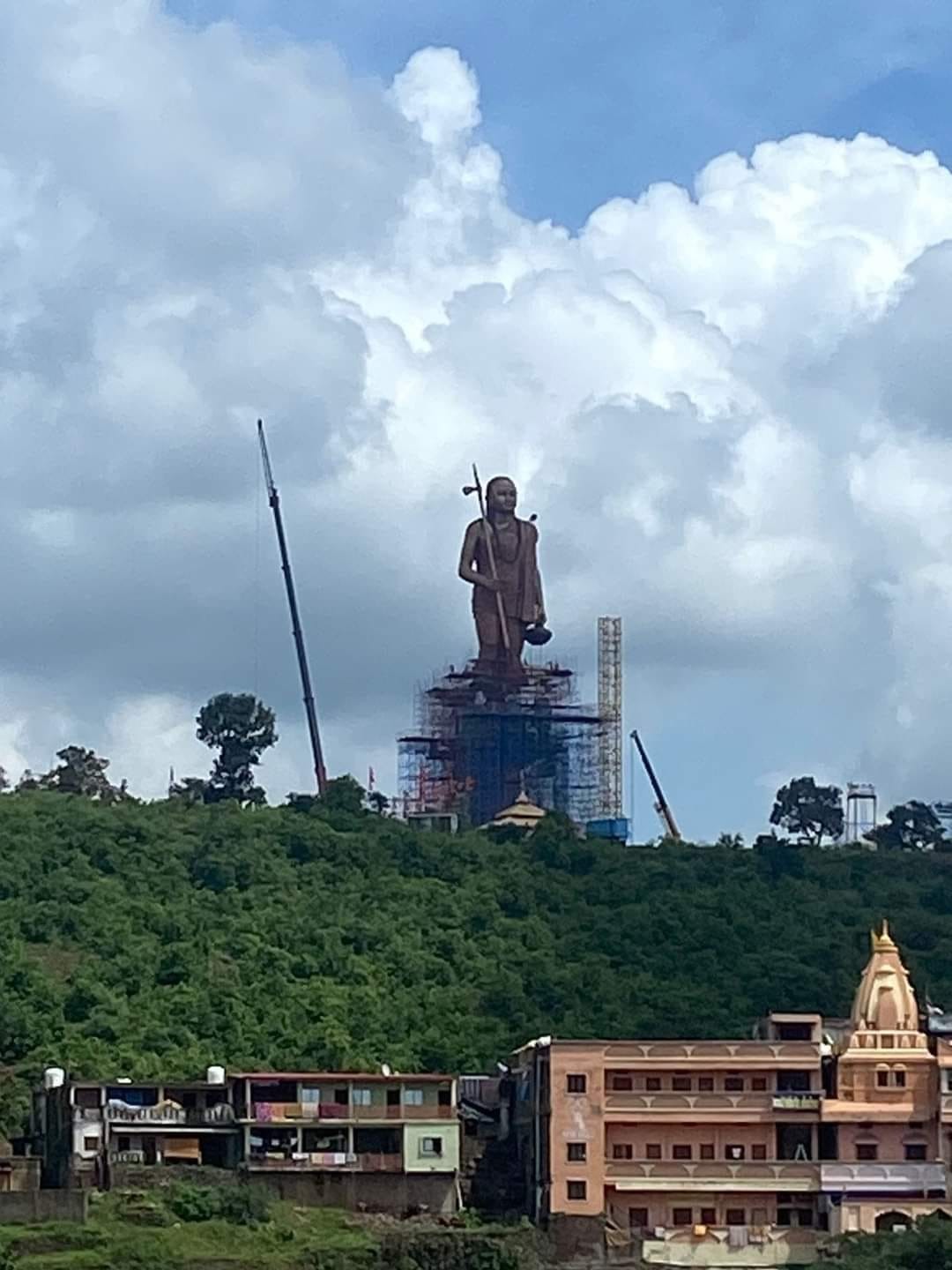 The magnificent monument is situated on a high hill in the centre of Mandhata Island on the Narmada River, in the holy town of Omkareshwar, as an eternal reminder of the Advaita Vedanta philosophy and the life and teachings of the revered saint Sri Adi Shankaracharya. The statue is also visible from afar, with a total height raised from the ground of 60m, and the statue itself 33m high.
