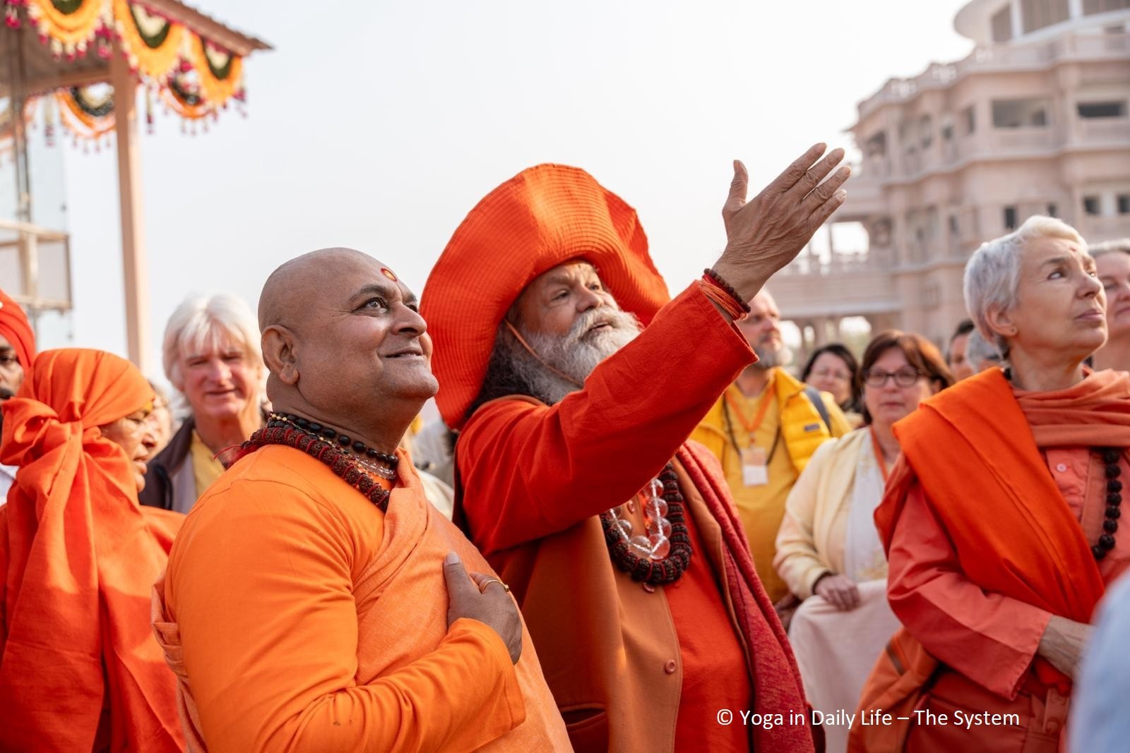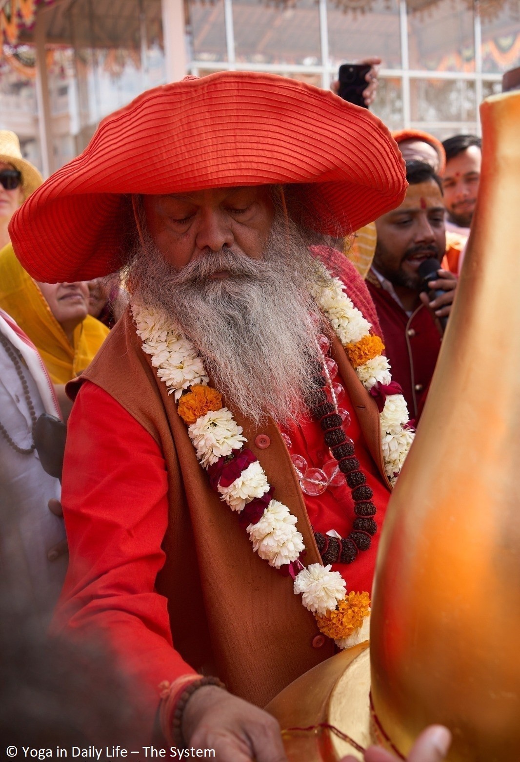On 14 February, the Prashad Purush Puja was performed for all five golden Kalashas. After the puja, Vishwaguruji went with some of his sannyasis (monastics) to the top of the Shiva temple to consecrate the place with mantras and ceremonies.