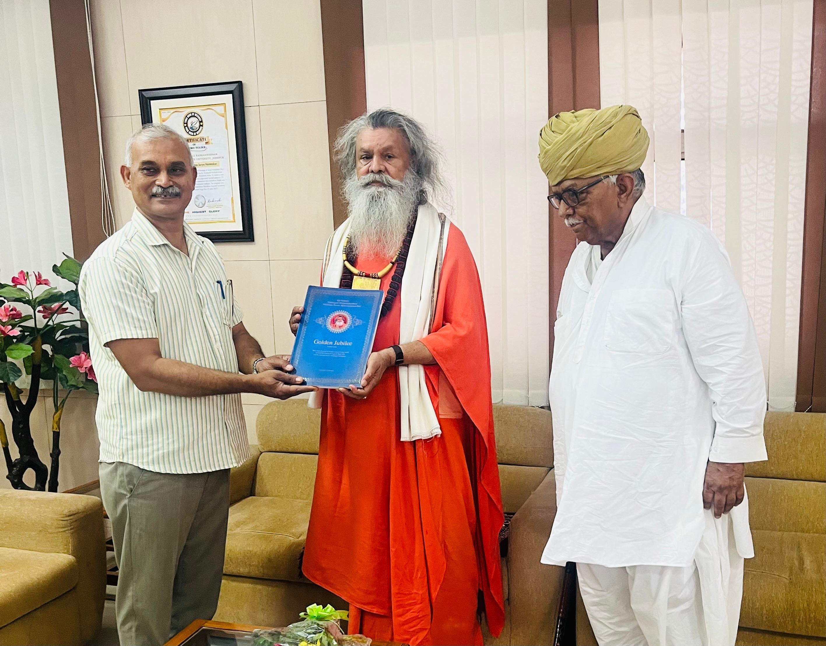 Vishwaguruji presented professor (Vaidya) Pradeep Kumar Prajapati, Hon'ble Vice Chancellor Golden Jubilee book in the presence of Dr Narayan Singh Manaklao, respected social worker from Jodhpur.