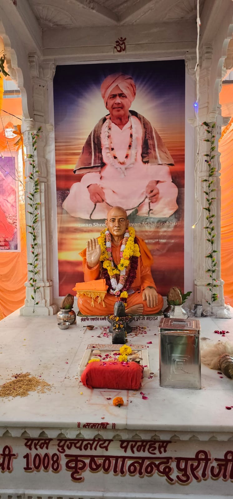 On the day after Gurupurnima celebrations in OM Ashram, Vishwaguruji went to Sri Sri Madhav Krishna Ashram in the town of Bassi, Rajasthan, to inaugurate new murtis (statues) of Sri Devpuriji and Swami Krishnanandji, disciple of Sri Swami Madhavanandaji – Holy Guruji.