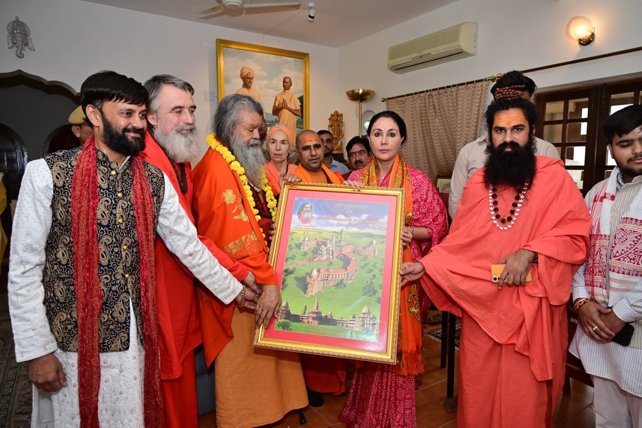 Diya Kumariji wrote about visit: "I felt supernatural peace and divine energy by visiting Om Ashram located in Pali. It was very pleasant and inspiring to receive the blessings of Vishwaguru Mahamandaleshwar Swami Maheshwaranand Ji Maharaj on this auspicious occasion. Spiritual atmosphere, Vedic sounds and sacred tradition of meditation filled the mind with amazing peace."