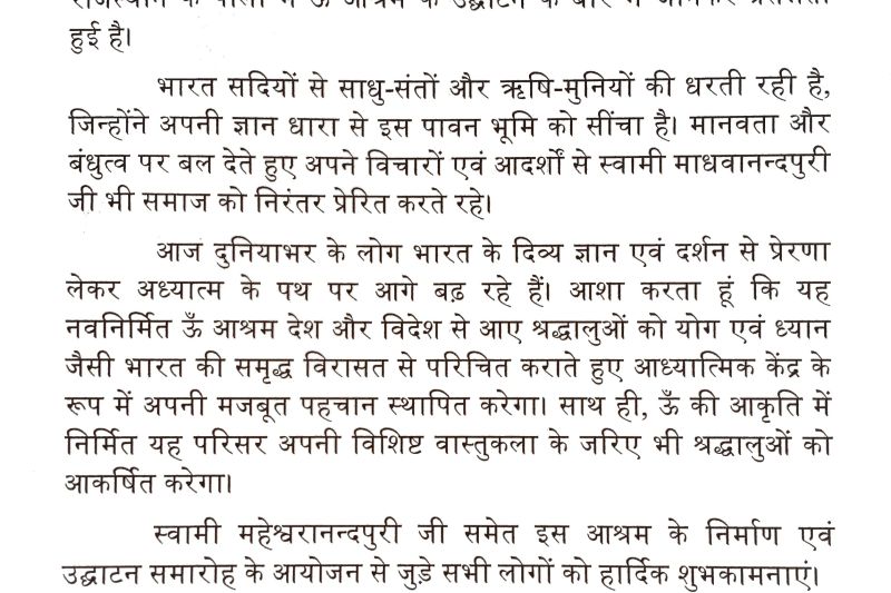 The Prime Minister of India, the Honourable Narendra Modi Ji sent a message of congratulations for the Grand Opening of OM Ashram.