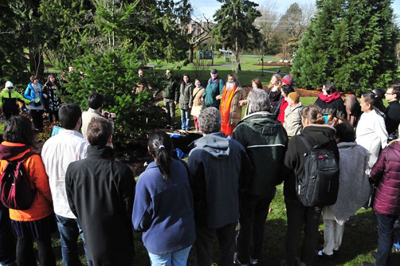 Despite weather forecasts for rain, the sun showed its glorious face as more than forty people, including an Official from the City of Vancouver, as well as representatives from various yoga Centers attended the Ceremony and initiated the tree with Mantras and blessings.
